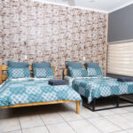 This lovely 4 bedrooms chalet hosts up to 14 guests. Perfect for a small crowd that want to experience the Bushveld as a group in a spacious environment. If you want peace and tranquillity this is the place to be. The Sandton chalet is equipped with a private lounge, kitchen, DStv, Wi-fi and it has a private swimming pool. The kitchen is equipped with a gas stove, fridge, and braai area.
